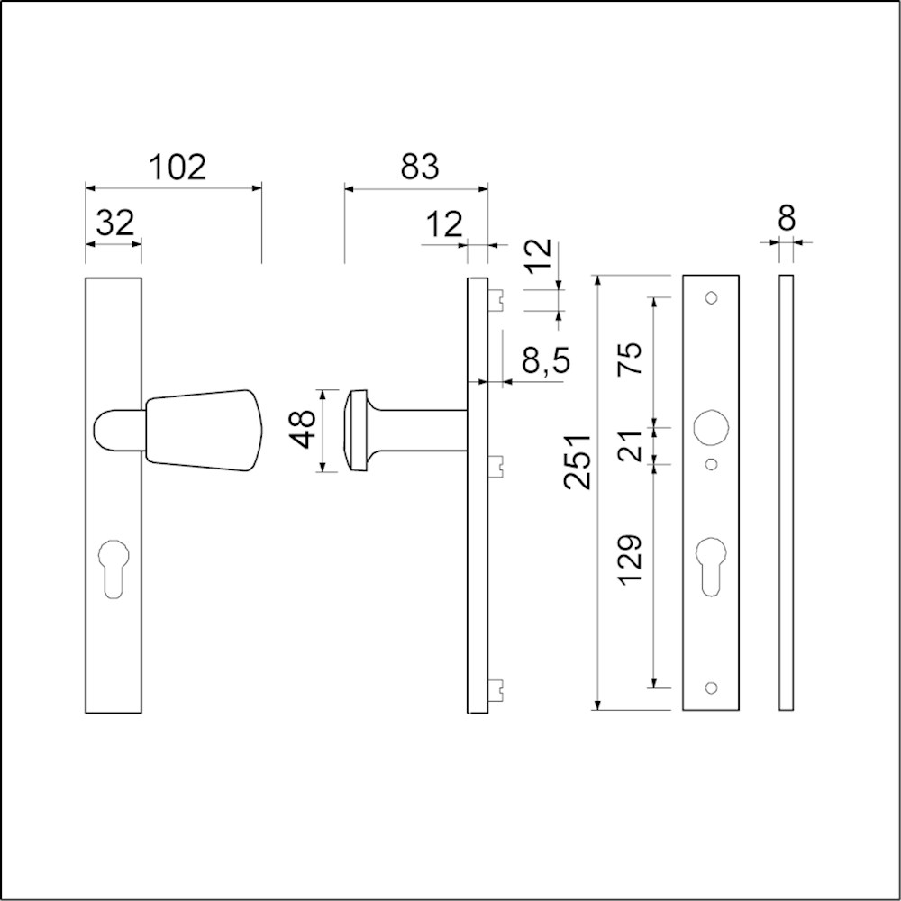 Complete set: Buitenschild 12 mm met knop 166 vast of vastdraaibaar, binnenschild 8 mm met deurkruk 357 vastdraaibaar, vierkantstift 8 mm en 3 schroeven M6 RVS.