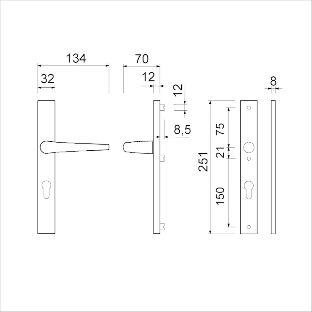 Complete set: Buitenschild 12 mm met deurkruk 357 vastdraaibaar, binnenschild 8 mm met deurkruk 357 vastdraaibaar, vierkantstift 8 mm en 3 schroeven M6 RVS