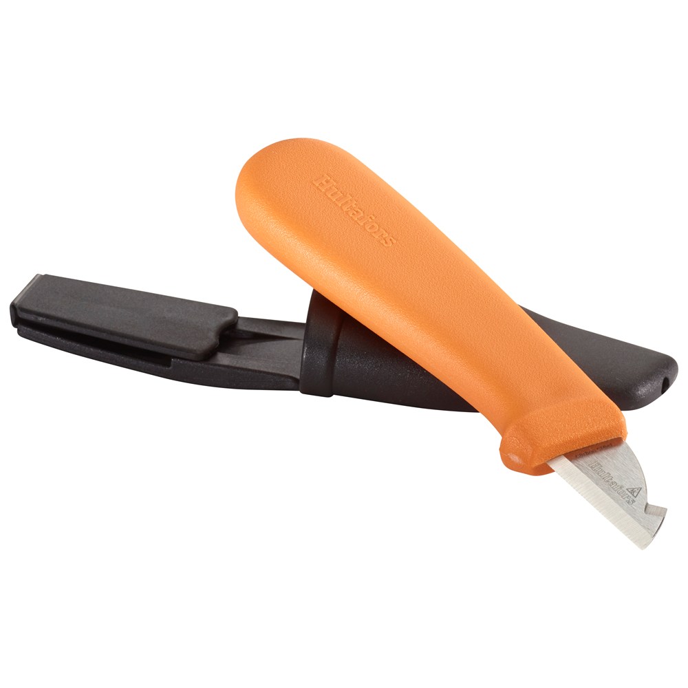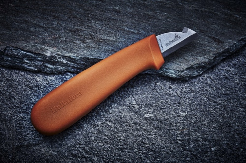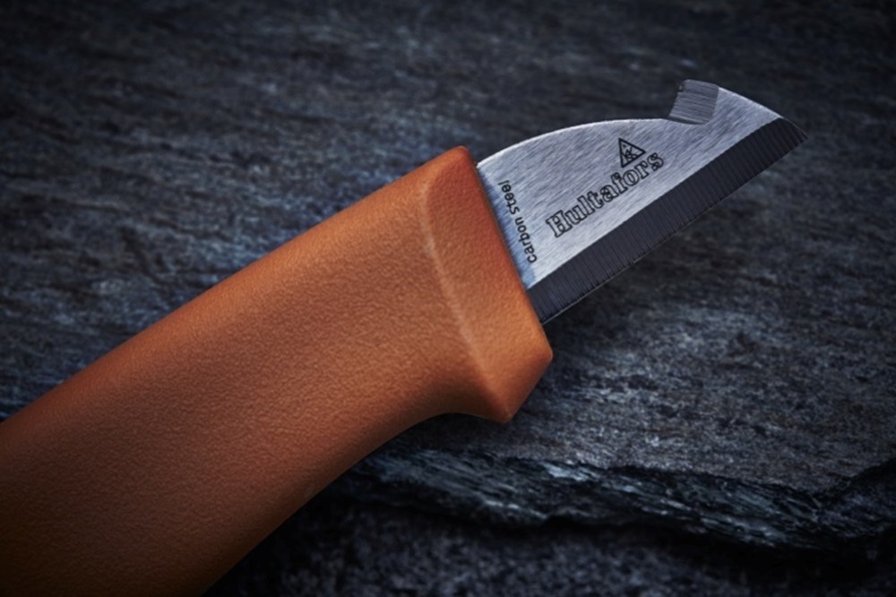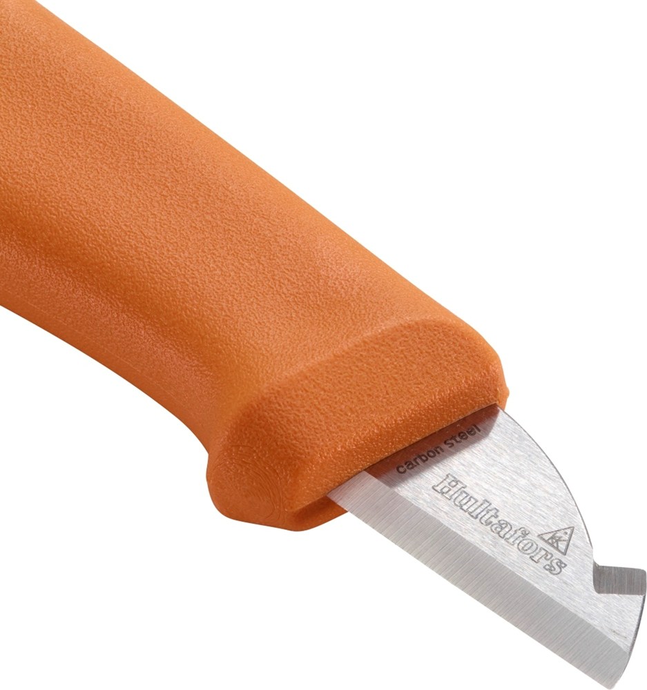 Dit Hultafors mes heeft een speciale vorm met heft specifiek ontworpen voor het strippen van elektriciteitskabels. Dit mes is uitgerust met een unieke functionaliteit. Het holster kan aan de knoop van uw werkkleding of riem worden vastgeklikt. Hierdoor kan zorgeloos worden doorgewerkt zonder dat het holster loskomt. Het lemmet is gemaakt van Japans messenstaal, 1,5 mm carbonstaal, dat is gehard tot 58–60 HRC.