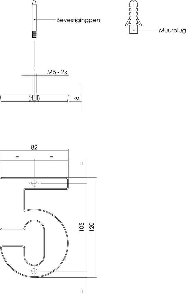 Modern huisnummer 5 in een messing uitvoering. Naderhand is dit product gepolijst en voorzien van een laklaag, waardoor hij een glanzende uitstraling krijgt. Dit huisnummer heeft een hoogte van 120 mm en een dikte van 7 mm. Montage is eenvoudig met het bijgeleverde bevestigingsmateriaal.