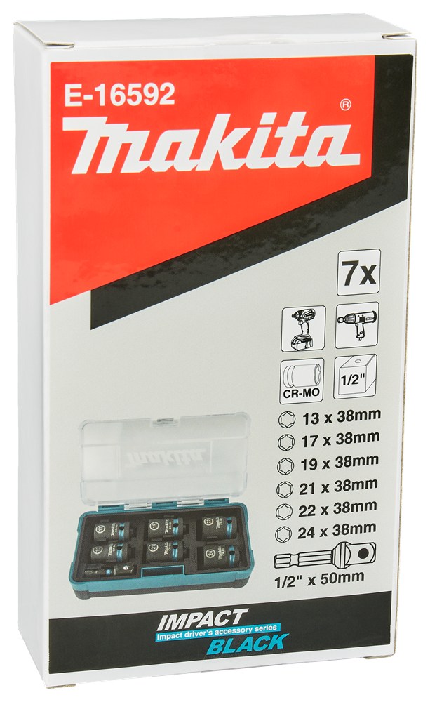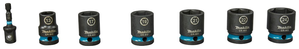Makita heeft diverse krachtdoppensets in het assortiment. De krachtdoppen zijn gemaakt van CR-MO staal. Door het speciale productieproces wordt een hoge materiaaldichtheid verkregen waardoor de doppen uiterst taai zijn. Hierdoor wordt een lange levensduur en nauwkeurige passing gewaarborgd. Makita heeft zowel lange als korte krachtdoppensets in het assortiment. Al deze krachtdoppen kunnen de kracht weerstaan van slagmoersleutels. 7-delige Makita krachtdoppenset uit de Impact Black serie. Krachtdoppen met 1/2" VK aansluiting in de maten 13 - 17 - 19 - 21 - 22 - 24m, inclusief krachtdop adapter.