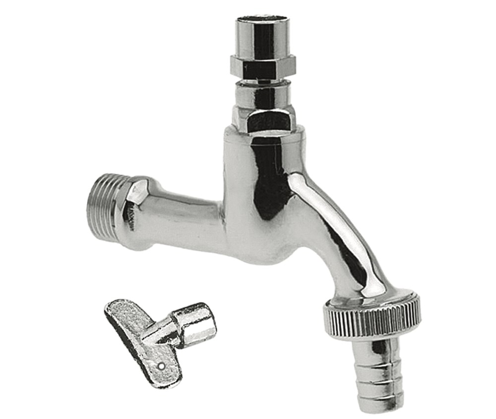 Zakverpakking: Kranen. Sanitaire tapkraan met slangkoppeling ingericht voor sleutel.