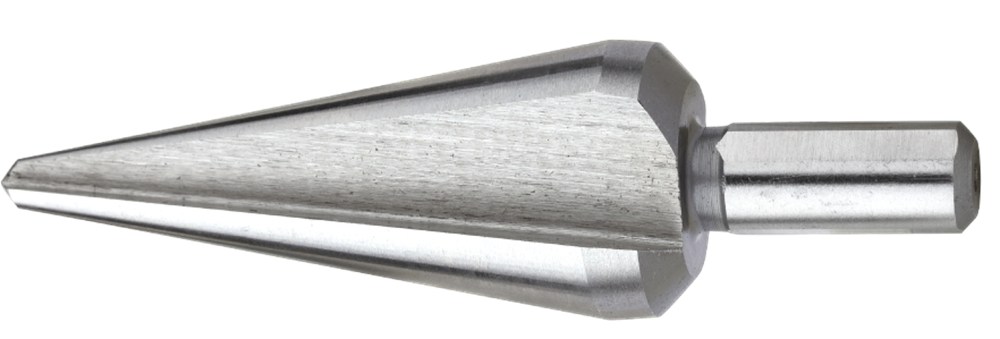 CBN-geslepen plaatboor uit massief HSS. De teruggeslepen conus zorgt ervoor dat bij het doorboren van het materiaal, de boor zonder moeite kan worden teruggetrokken.