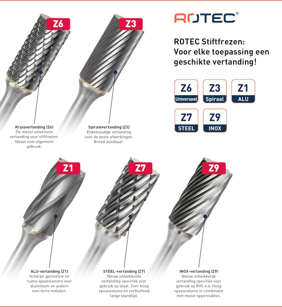 Hardmetalen stiftfrees in kegelvorm spits, in diverse vertandingen.