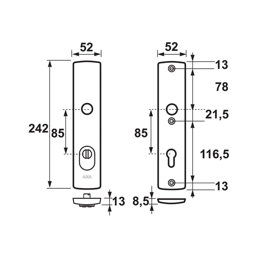 - standaard toepasbaar op deuren van 38 tot 40 mm dik, voor dikkere deuren zijn verlengde krukstiften en bout leverbaar