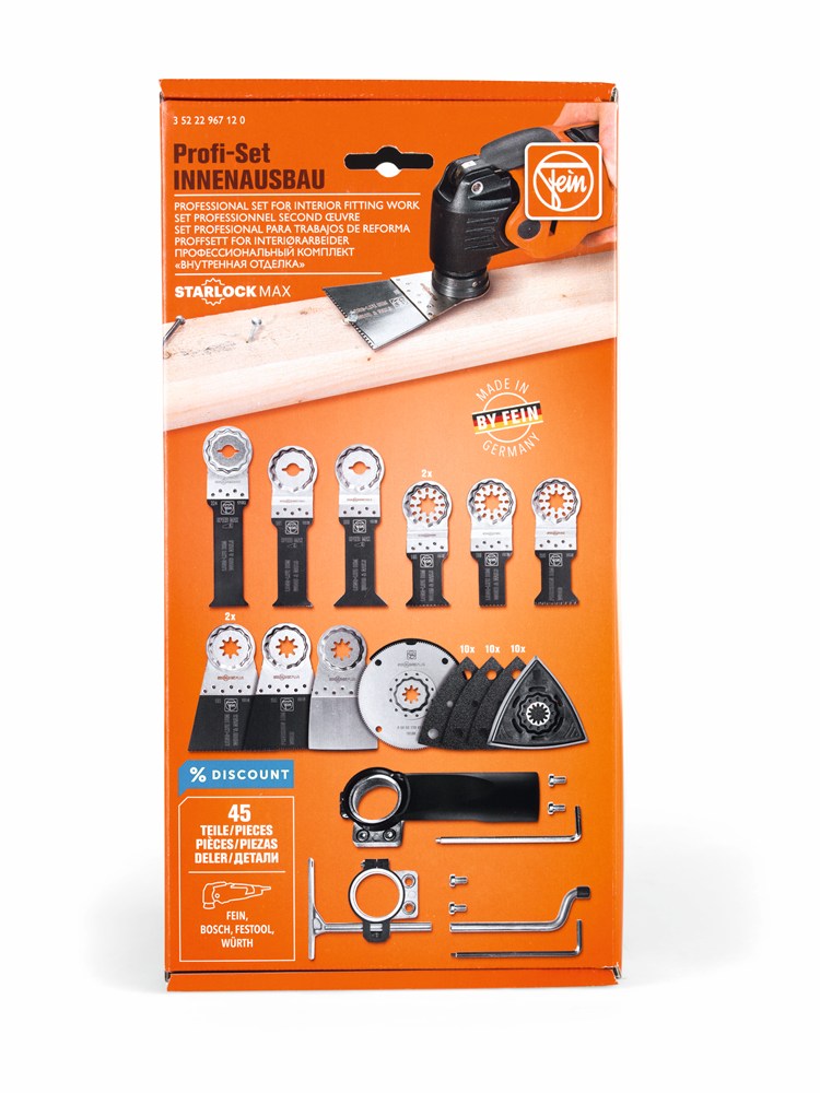 Professionele 45-delige accessoireset met uitgebreide zaagbladuitrusting voor het snel en nauwkeurig zagen tijdens alle montagewerkzaamheden. Geschikt voor alle multitools van FEIN met StarlockMax-houder en alle andere gangbare multitools met StarlockMax-houder.