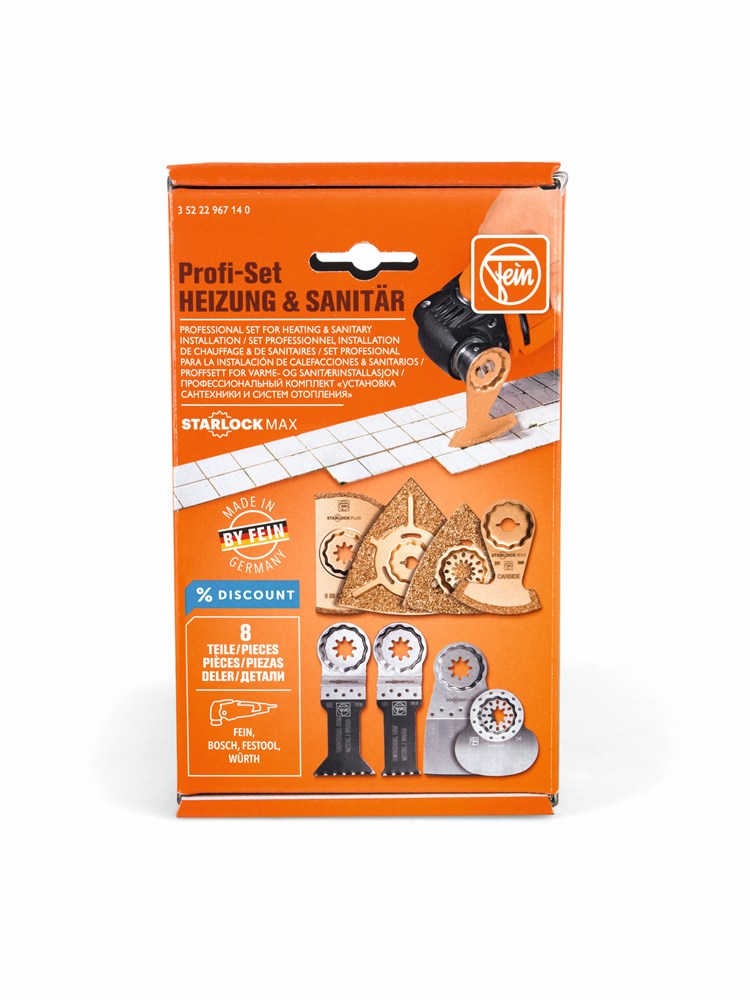 Professionele 8-delige accessoireset met uitgebreide uitrusting, speciaal voor de belangrijkste toepassingen bij reparaties aan sanitair. Geschikt voor alle multitools van FEIN met StarlockMax-houder en alle andere gangbare multitools met StarlockMax-houder.