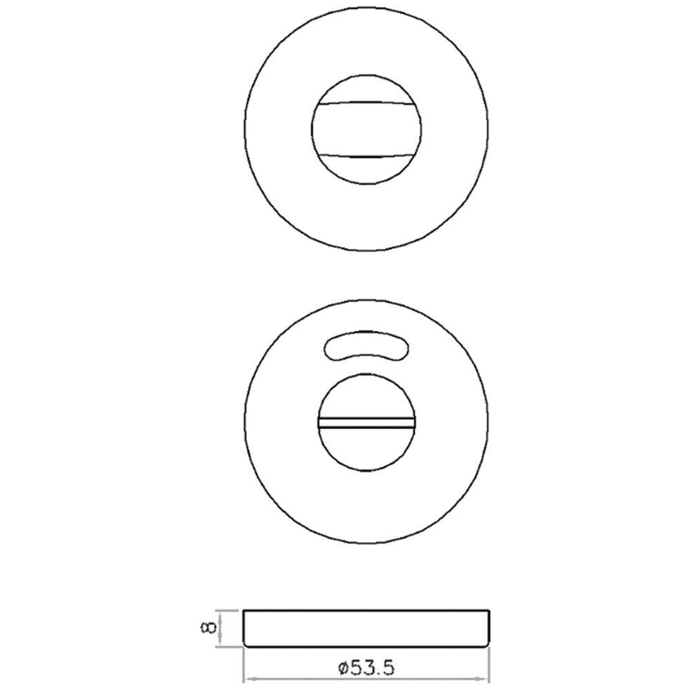 Afdekrozetten uit roestvrij staal, grondstof n° 1.4301 (A3-AISI 304), fijn-mat oppervlak, verborgen bevestiging met vernikkelde hulsschroeven M4. Mogelijke sleutelopeningen, baardsleutel (BBT), profielcilinder (PZ), RZ 22 CH, blind (Blind) en bad-noodopening, gleuf of met vierkantsleutel. Standaard deurdikte 35 - 44 mm.