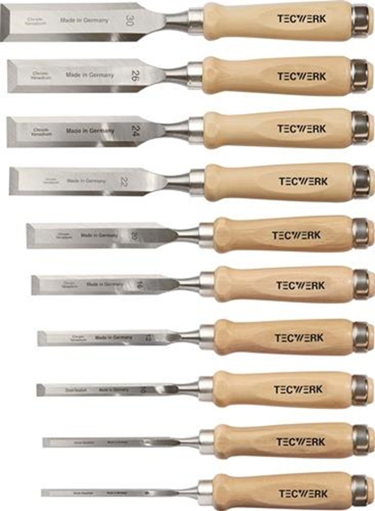 Chroom-vanadiumstaal · Fijngeslepen beitel · Witte beukenhouten greep model Ulm · Met klem