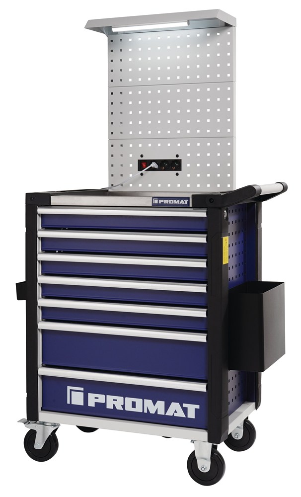 met RVS-werkvlak · met 7 op kogelgelagerde, met telescopische rails uittrekbare laden 100 % uittrekbaar · automatisch intrekken van de lade met ladeveiligheidssysteem verhindert vanzelf opengaan van de laden · met centrale vergrendeling (slechts één lade gelijktijdig geopend) · afsluitbaar met ingebouwd cilinderslot met 2 sleutels · hoogwaardige PVC-wielen – 2 vaste en 2 zwenkwielen met rem · systeemperforatie aan beide zijden (9 x 9 mm) · doorlopende hoekbescherming aan de zijkanten afmetingen compleet opgebouwd met greep en wielen (b x d x h) 788 x 471 x 969 mm (zonder achterwand) afmetingen alleen corpus (b x d x h) 678 x 459 x 777 mm binnenmaat laden (b x d x h) 5x 568 x 398 x 75 mm binnenmaat laden (b x d x h) 2x 568 x 398 x 154 mm draagkracht per lade 30 kg / totale statische belasting 400 kg uitrusting: 1 x afvalbak 1x aflegvak perforatie voor laptophouder (niet in de leveringsomvang inbegrepen.) achterwand met EURO-perforatiewandsysteem 9 x 9 mm (inclusief LED-verlichting en 2 veiligheidcontactdozen) · Levering zonder gereedschap/inhoud