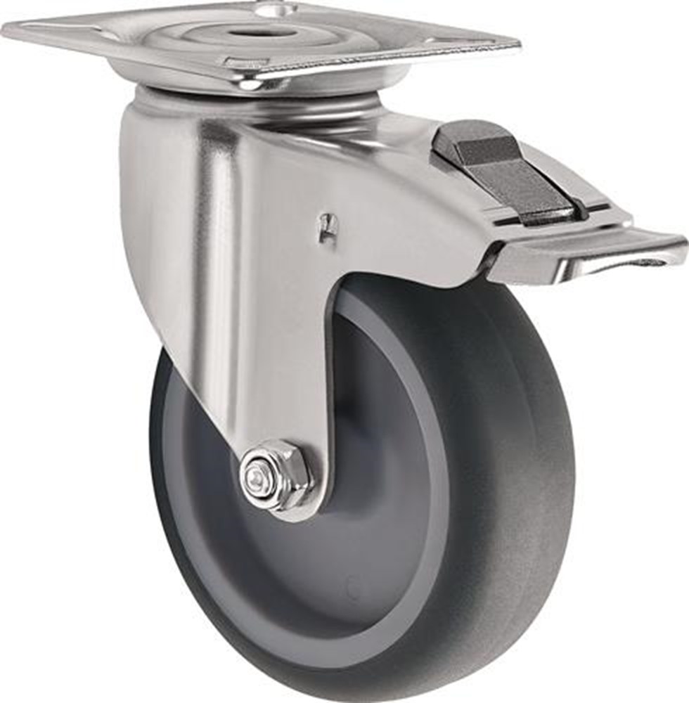 Apparaatwieltje · Behuizing van galvanisch blauw verzinkt staalplaat · Corrosieongevoelig · Tweerijige lagerkrans in de gaffelkop · Thermoplastische rubberen banden (grijs) op kunststof velg · Glijlagers · Met plaatbevestiging · Totale blokkering van metaal nalopend gemonteerd, voor alle afmetingen identieke vorm