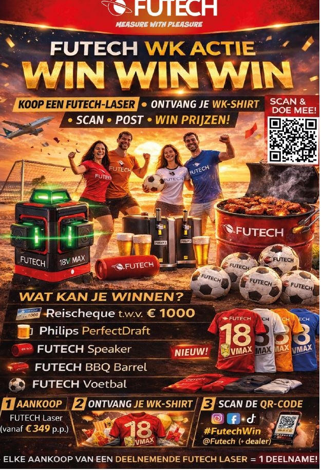 - Koop een Futech toestel* vanaf €349,= ex btw en ontvang een gratis WK shirt (zolang de voorraad strekt) *uitsluitend 3D of 4DE 18V MAX