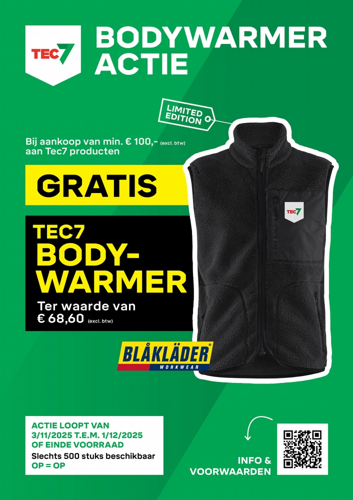 - Koop gedurende de actieperiode voor min. € 100,- (excl. btw) aan Tec7 producten en krijg een gratis Tec7 bodywarmer!*